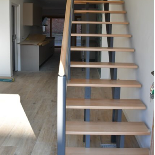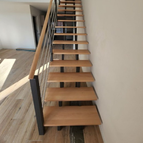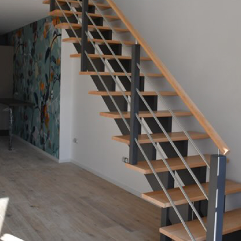 Un escalier sans contremarches, qui associe marches et main courante en hêtre massif à une structure centrale métallique avec finition RAL 7016.