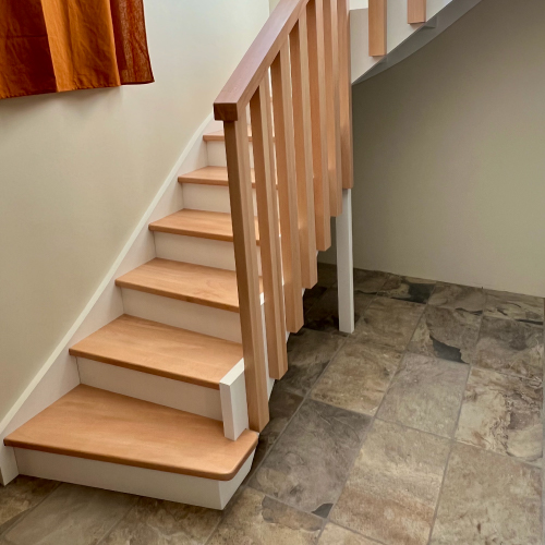 Escalier modèle Clauska en hêtre brut avec finition vernis incolore réalisée par Finitop. Il se distingue par sa marche de départ double saillante, sa structure à limons et sa rampe type claustra assortie. Contremarches blanches (RAL 9016) et tête de poteau arrondie pour une finition sobre et contemporaine.
