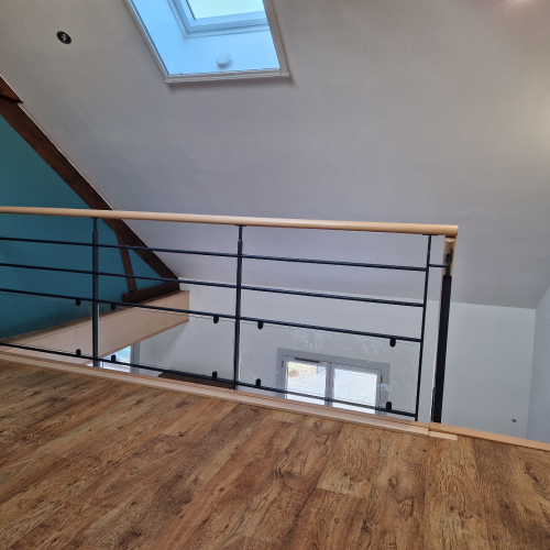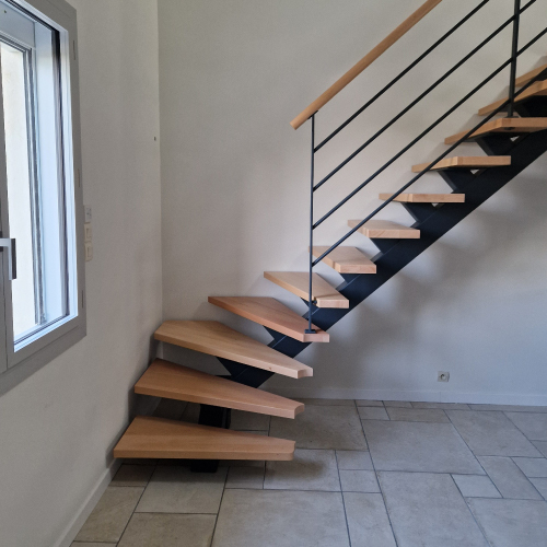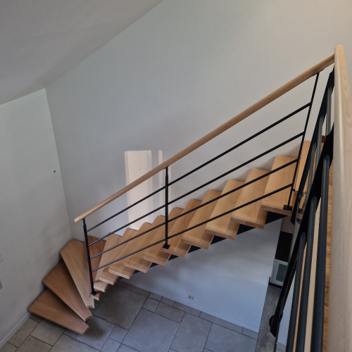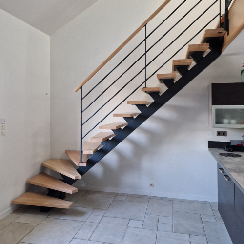 Un escalier sans contremarches, qui associe marches et main courante en hêtre massif à une structure centrale métallique avec finition RAL 7016.