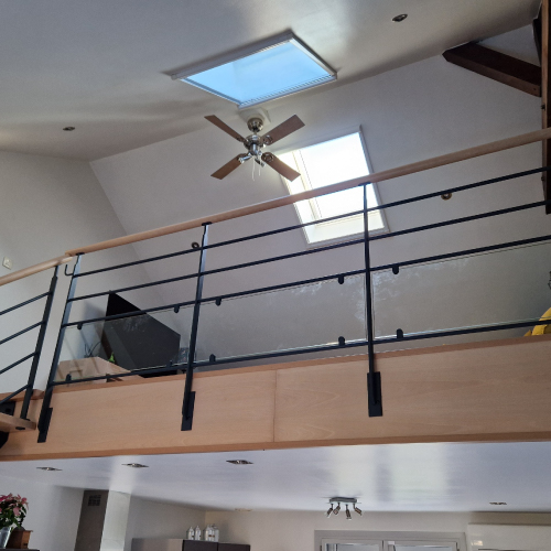 💡 Le détail qui fait la différence ? Des poteaux en métal plat avec lisses soudées et son garde-corps étage avec soubassement en verre !
